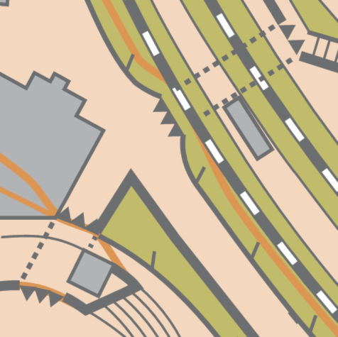 Underganger er markert med små sorte trekanter og stiplede linjer. De små sorte trekantene (haitenner) markerer åpningen på undergangen. De stiplede linjene viser selve undergangen. På kartutsnittet over er det to slike underganger. Nede i venstre hjørne er det en vanlig gangtunnel. Øverst i høyre hjørne er det eng gangtunnel som går under to jernbanespor.