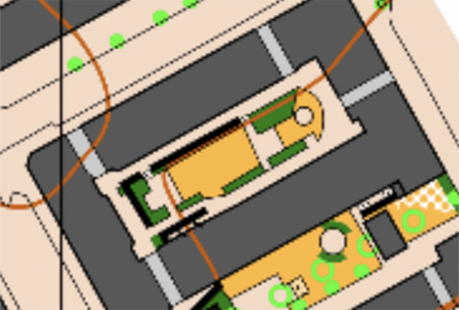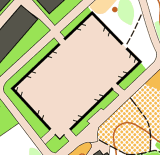 Passasjer gjennom bygninger er markert med lysegrått. Det er lovlig å løpe gjennom disse passasjene.