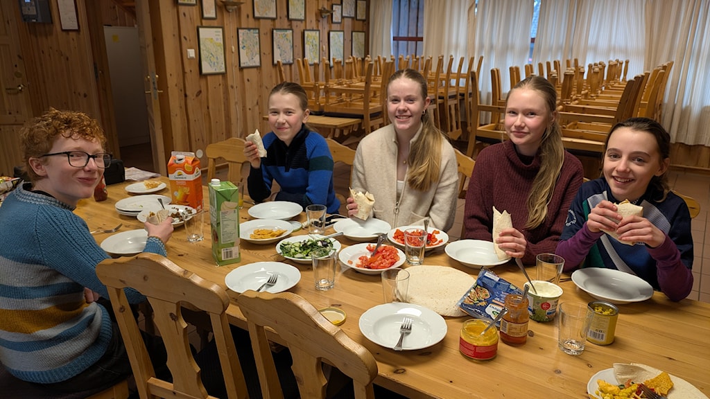 Første økt var noen korte stafett-løyper i skogen rundt hytta. Etter noen løyper bar det inn igjen til lunsj. Det var brødskiver og sveler som gjalt. Mer lek før andre økt.