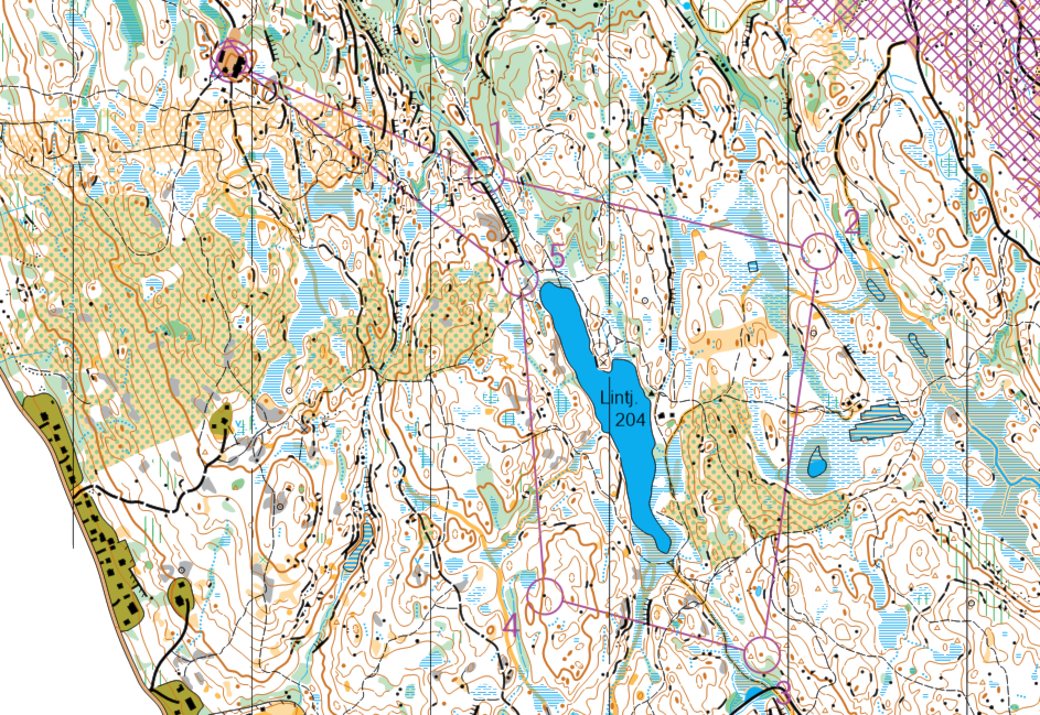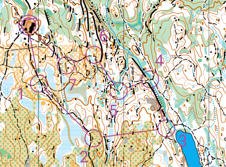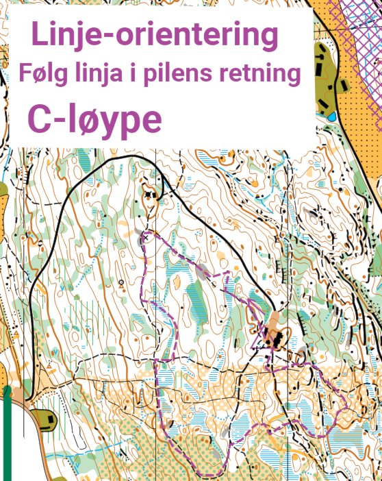 Fredagsøkten var linjeorientering. Her deles barna opp to grupper. En gruppe løp i én retning og den andre en annen. Dette var en fin økt i et nydelig terreng. Det var helt mørkt, men himmelen var mer eller mindre oransje. Her er C-løypa: