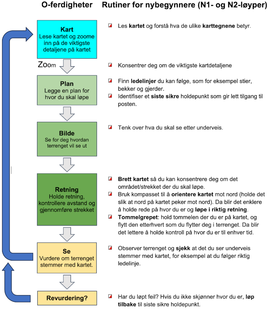 Denne modellen gjelder uansett om man er nybegynner eller eliteløper. Figur 2 nedenfor illustrerer Plan-Bilde-Retningsmodellen og hva den betyr for nybegynnere.